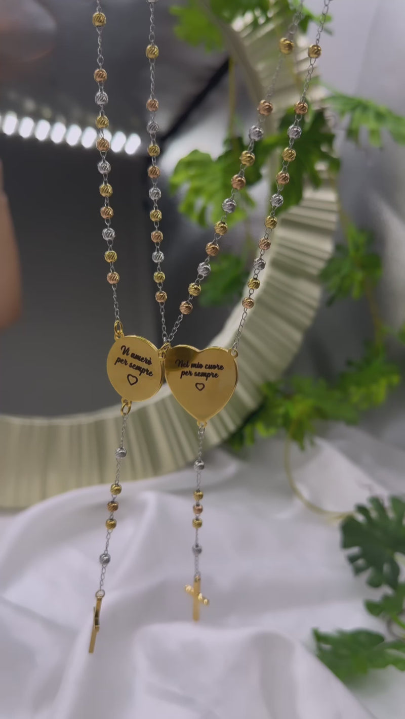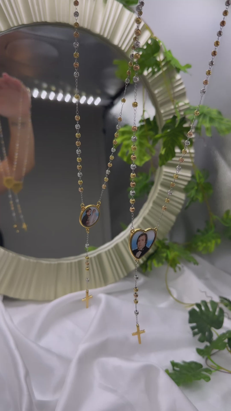 Il Rosario “MILLE LUCI” con foto a colori è interamente in acciaio inossidabile (non scambia) ed è personalizzabile con qualsiasi foto. Realizzabile a forma di cuore o a forma di cerchio, in base GOLD (oro) e in base SILVER (argento). È possibile incidere anche una dedica sul retro.